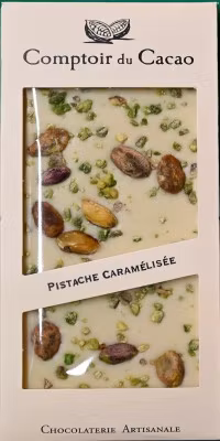 Vit choklad med karameliserade pistagenötterComptoir du Cacao från Frankrike erbjuder en riktigt mästerlig choklad. Genom sina högkvalitativa råvaror och sin ch